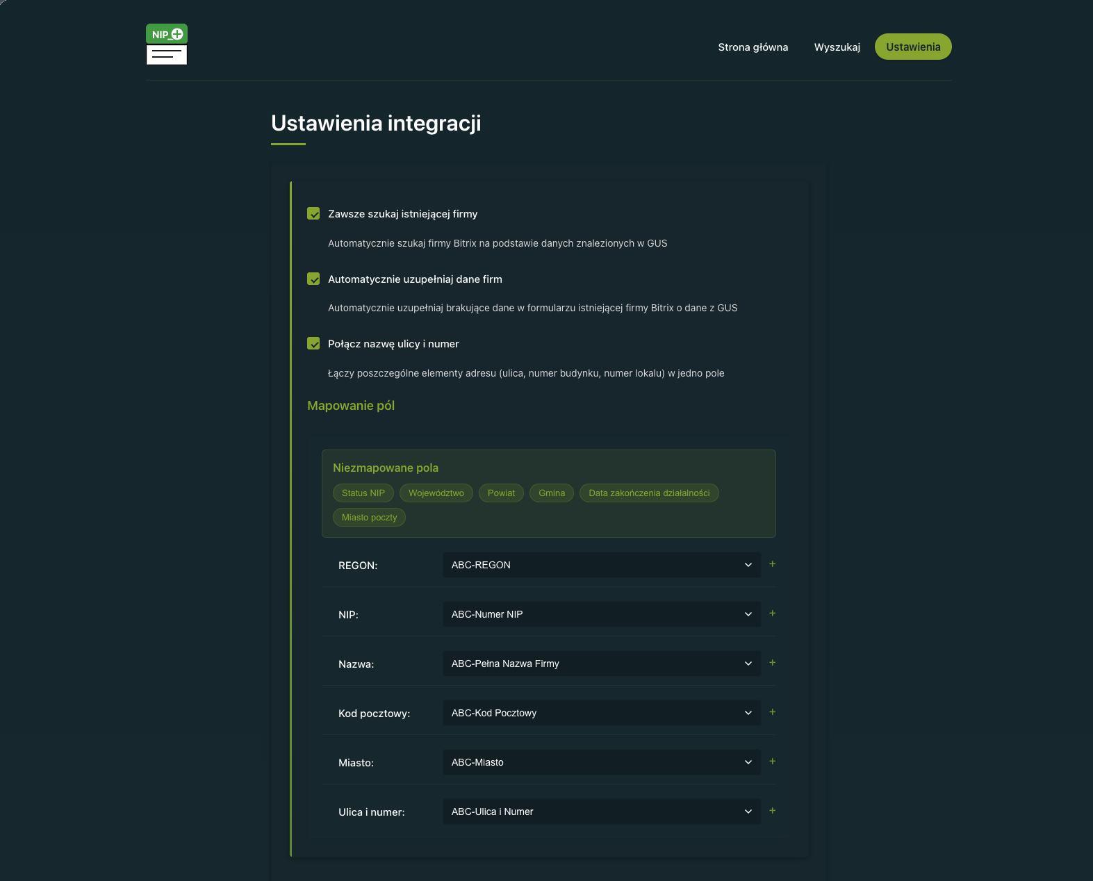 Ta całkowicie darmowa aplikacja integruje Bitrix24 z polską bazą danych Głównego Urzędu Statystycznego (GUS), umożliwiając użytkownikom wyszukiwanie rekordów firm, porównywanie ich z istniejącymi danymi Bitrix24 i łatwą aktualizację informacji o firmie. Obsługuje ręczne wyszukiwanie z głównego panelu aplikacji, automatyczne dopasowywanie z karty firmy i zawiera niestandardową aktywność przepływu pracy do wykorzystania w automatyzacji Bitrix24 CRM.